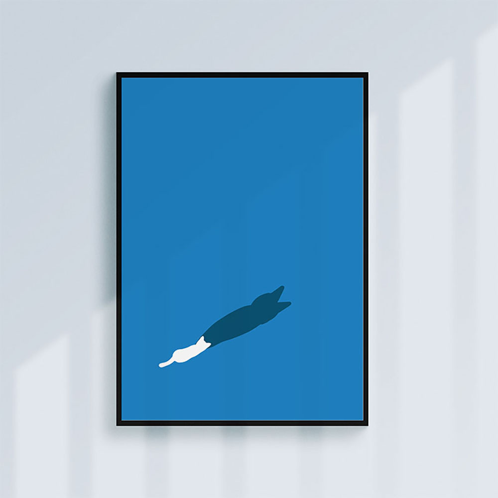 푸른 배경 위, 하얀 고양이의 몸에서 길게 뻗어난 그림자가 선명하게 자리합니다.